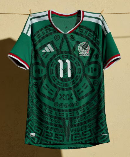 La camiseta recupera el verde icónico de la selección mexicana e incluye un diseño central con inspiración en el calendario azteca, reinterpretado de forma moderna para no sobrecargar visualmente la prenda. Este detalle busca conectar directamente con el patrimonio histórico de México y reforzar la idea de orgullo cultural en un torneo que se juega en "casa".