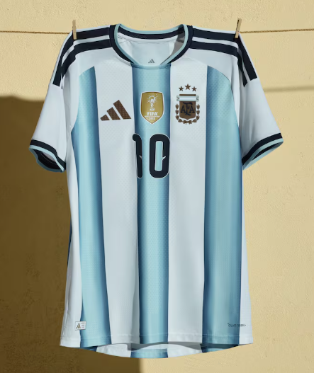Sin duda debemos mencionar a la actual campeona del mundo. Para la Selección Argentina, Adidas apuesta por mantener las franjas blancas y azules, distintivo futbolístico del país. Sin embargo, ha optado por un diseño con mayor textura, degradando el azul en los bordes hacia un tono más oscuro. De este modo, se introduce profundidad sin romper la identidad histórica del equipo.