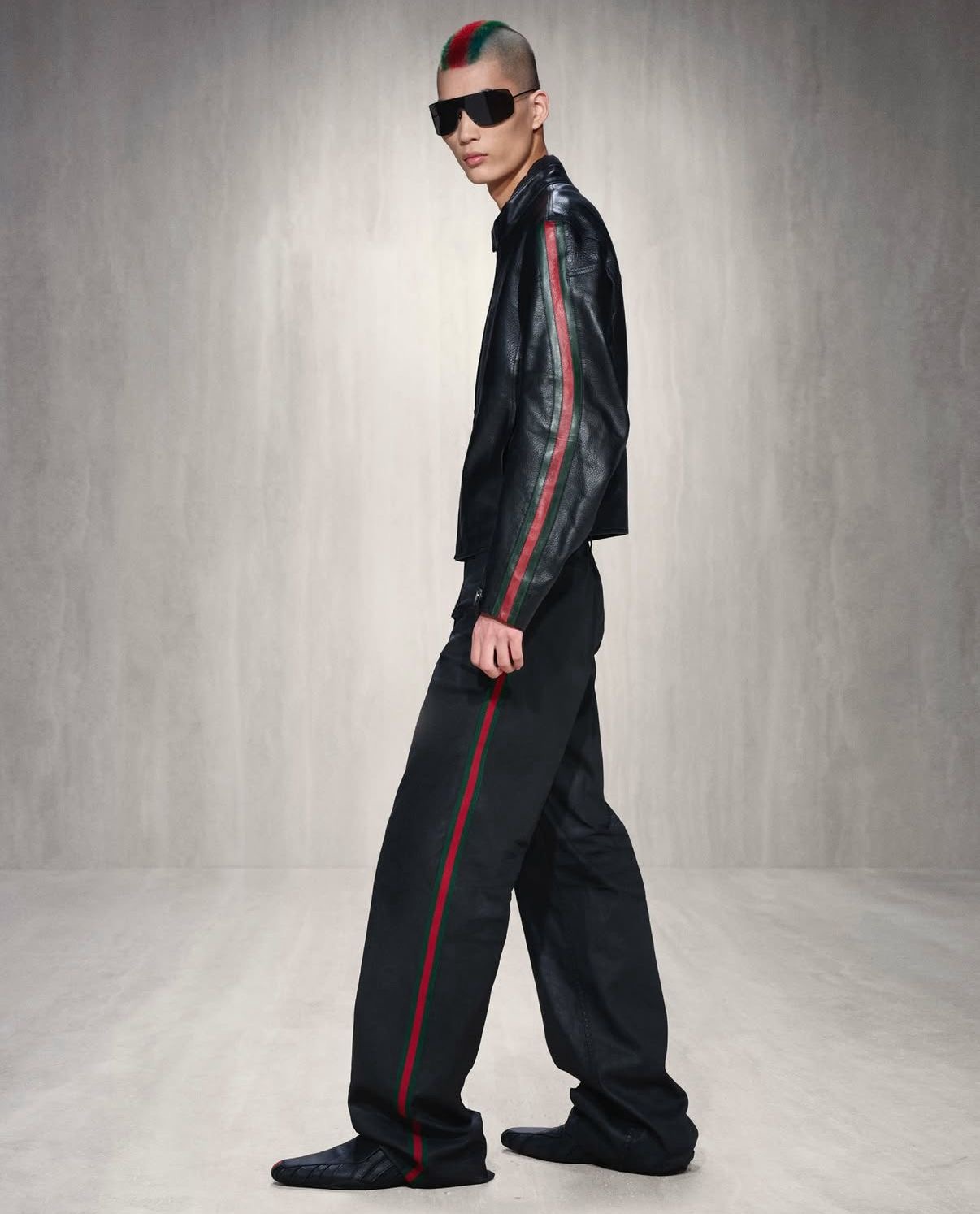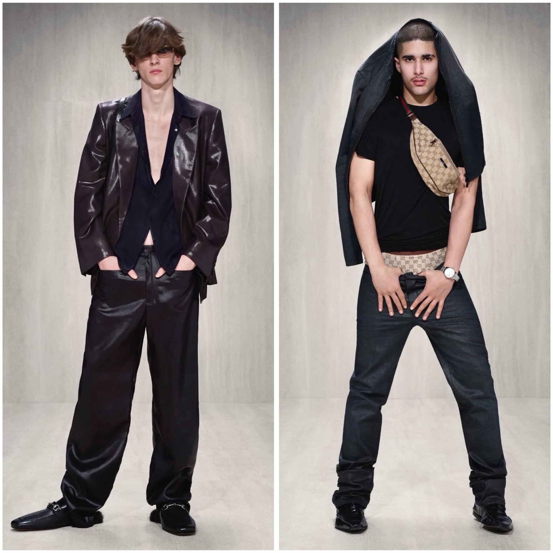 En el lado de la moda masculina destacan las camisetas ajustadas (muy ajustadas) para marcar músculo, por lo que en esta ocasión han desfilado modelos masculinos muy musculados. Zapatos tipo mule o mocasines de piel con puntera exagerada y pantalones elegantes con un corte más bien straight se encuentran en todos los looks del apartado de hombre de esta colección de Gucci. Outfits muy chic a la par que minimalistas que chocan con algunos otros más cerca de lo urbano, con jorts, riñoneras y el clásico estampado con el monograma de Gucci.
