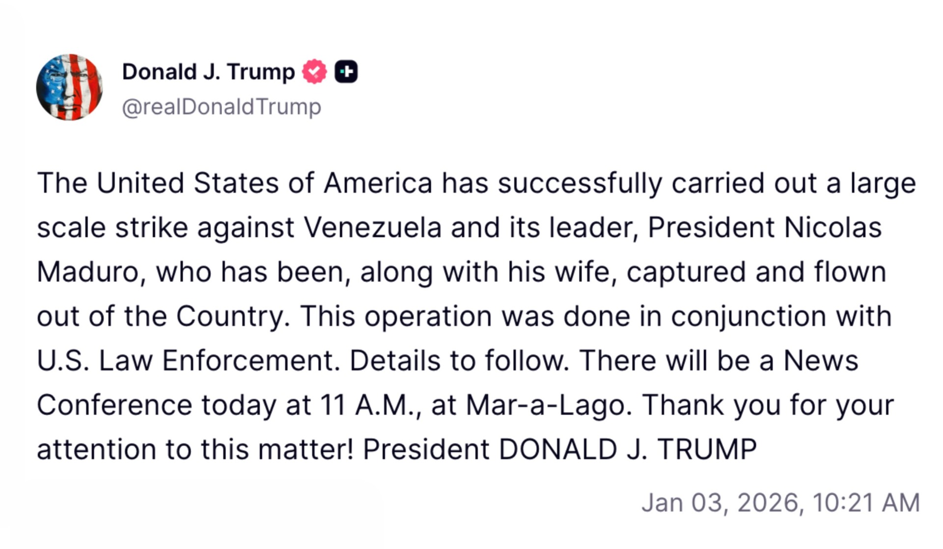 Trump ha detallado en su post que ofrecerá más detalles de la operación próximamente, afirmando que dará una rueda de prensa desde Florida a las 11:00 hora local (17:00 en España).